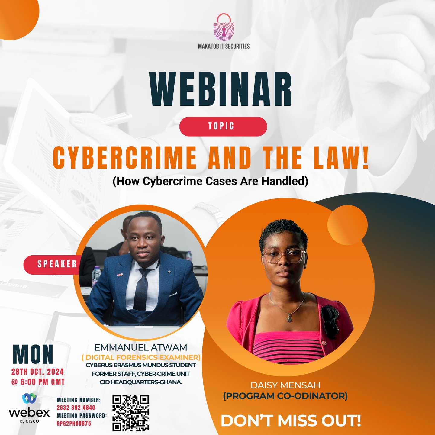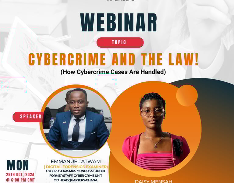 Join us for an insightful webinar titled "Cybercrime and the Law! (How Cybercrime Cases Are Handled)" with Emmanuel Atwam, a renowned Digital Forensic Examiner.