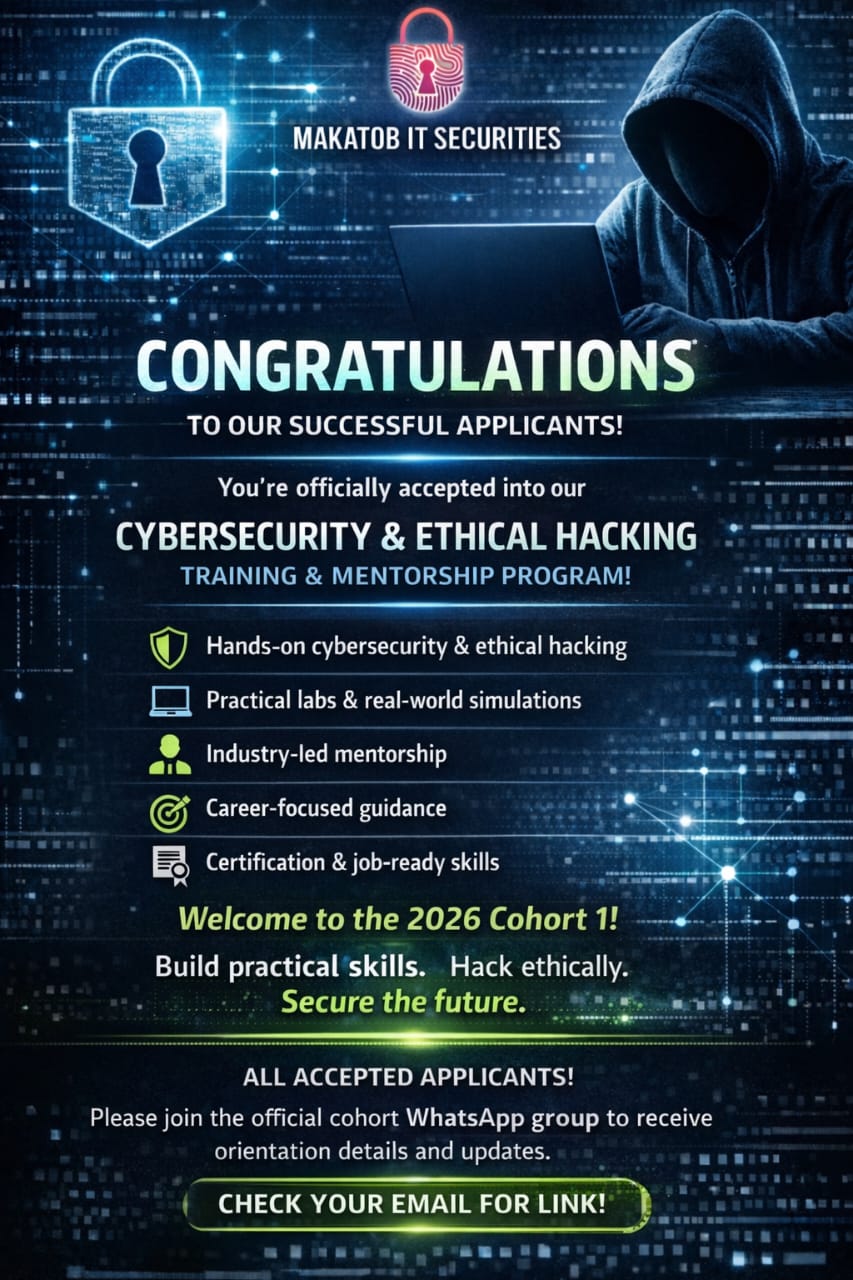 We are proud to officially welcome our newly accepted learners into the Cybersecurity & Ethical Hacking Training & Mentorship Program at Makatob IT Securities. To our newly admitted, congratulations! You are about to embark on an intensive, skill-driven journey into security.